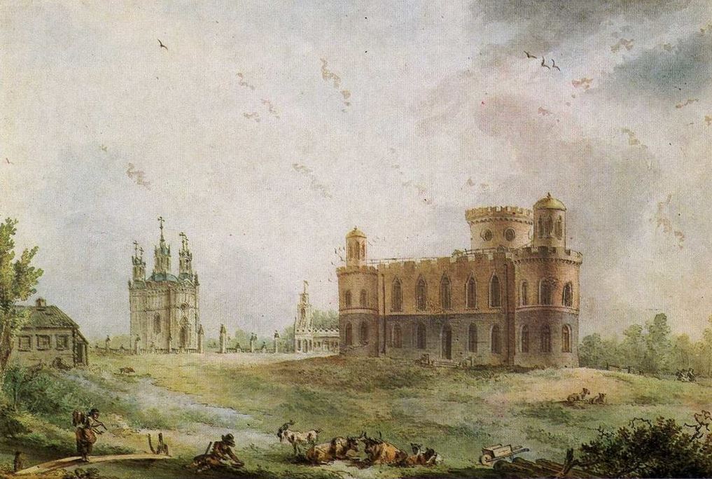 В 1774 году по приказу Екатерины II Юрий Матвеевич Фельтен начал строительство путевого дворца в духе русской готики — по дороге в Царское село. Местность, где шло строительство, называлась «Кикерики» (в переводе с финского — «лягушачье болото»). Оригинальный дворец представляет в плане равносторонний треугольник — по мнению ряда исследователей, его прообразом был английский Лонгфордский замок времён Елизаветы I. В Англии же специально для «Дворца на лягушачьем болоте» Екатерина заказала фаянсовый сервиз, на каждом из предметов которого была изображена лягушка. В 1777 году рядом с дворцом была торжественно — в присутствии самой императрицы и шведского короля Густава III — заложена церковь, тоже в стиле русской готики. Церковь состоит из четырёх полуцилиндрических объёмов и в плане образует «четырёхлистник». Пять барабанов завершаются куполами с миниатюрными шпилями и ажурными крестами. Над входом в церковь — нетипичные для православной традиции женские скульптуры «Вера» и «Надежда». В 1780 году, в честь десятой годовщины победы в Чесменской баталии дворец и церковь были переименованы в Чесменские. В силу своего назначения, путевой дворец нередко пустовал, а после смерти Екатерины и вовсе почти не использовался. В 1830-е годы дворец перестроили под богадельню для инвалидов-ветеранов Отечественной войны 1812 года.