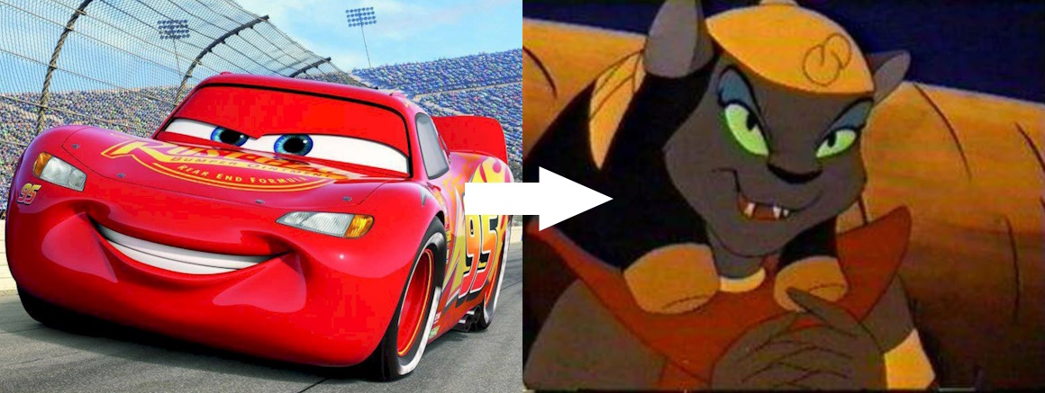 Мультипликационные герои — Молния Маккуин и Мираж из телесериала "Аладдин". Из "Молнии" в "Мираж" превратился кинотеатр на углу Большого проспекта и Шамшевой улицы.Ответ: деловая колбаса