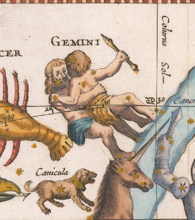 (Обратите внимание также на собачку у ног Близнецов. Это звезда Сириус, Canicula, в переводе — буквально «маленькая собачка». Да, каникулы так называются в честь неё. Желаем вам хорошего времени маленьких собачек!) -